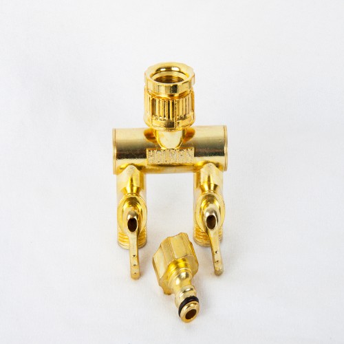 Tap 2 way splitter, metal (brass colour) with 20mm female thread Inlet and 20mm male threads on Outlets, Not pressure rated