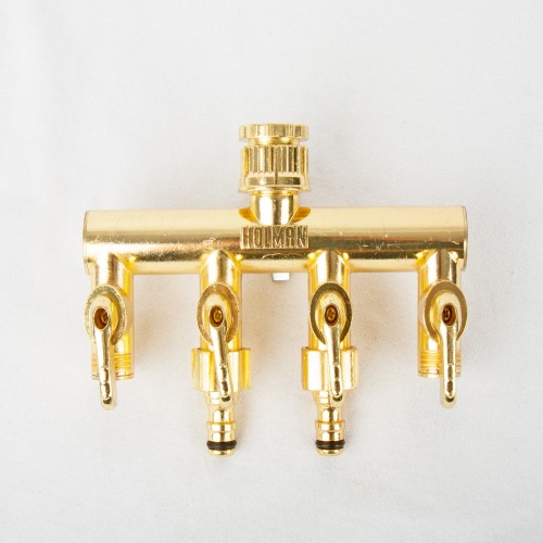 Tap 4 way splitter, metal (brass colour), 20mm female threaded Inlet and 20mm male threads on Outlets, Not pressure rated